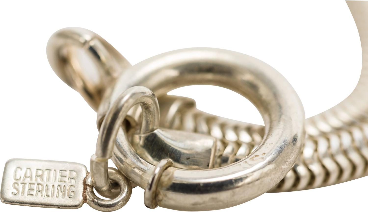 Sterling Silver Cuff Bracelet, Angela Cummings, designed as a rope knot, interior cir. 6 1/2, wd. 1 1/8 in., signed. $300-500 1080 Three Silver and Gold Jewelry Items, comprising a dolphin brooch and a ring, both signed Tiffany & Co., and a cultured pearl bar pin signed Cartier. $300-500 1081 18kt Gold Necklace, Roberto Coin, ... Retrieve Content